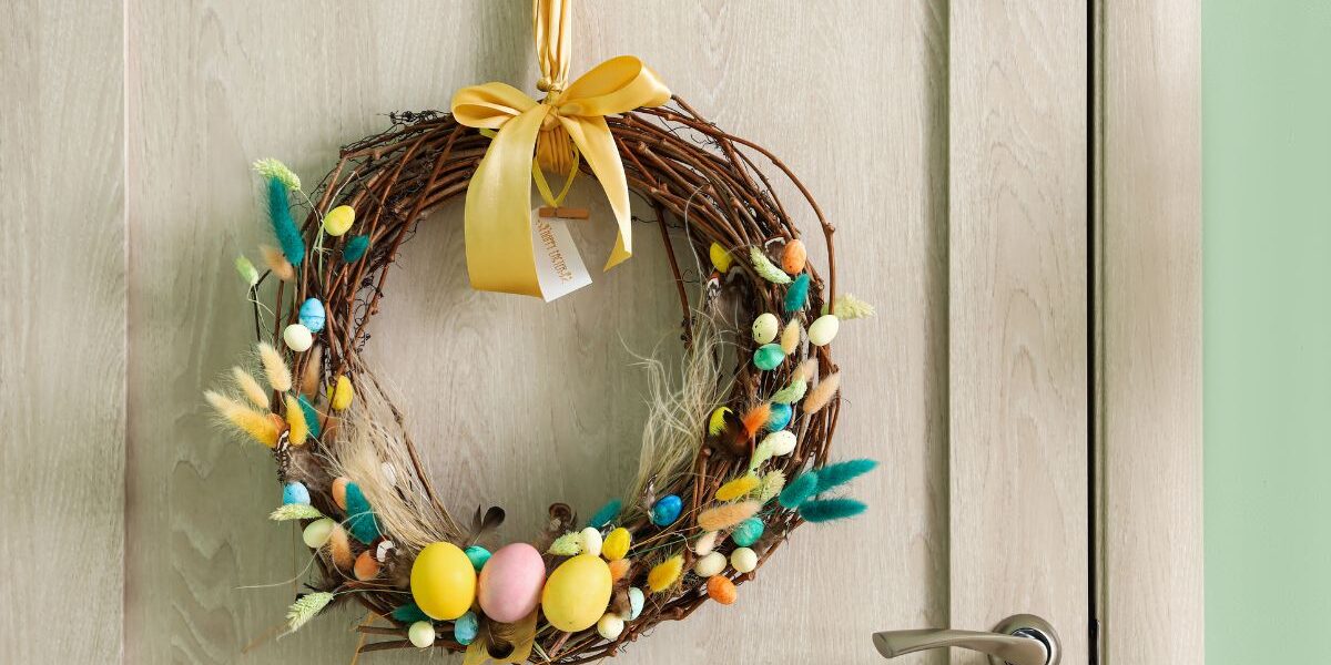 • świąteczny wianek na drzwi lub okno – możesz wykonać go samodzielnie z gałązek, bazi i sztucznych kwiatów, a następnie ozdobić pisankami i wstążkami,